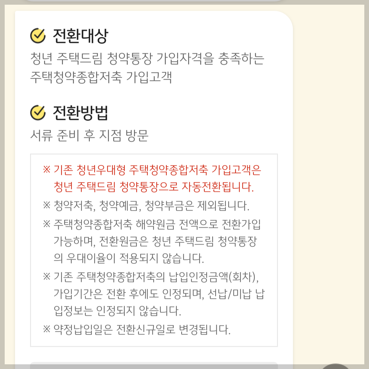 전환대상 : 청년 주택드림 청약통장 가입자격을 충족하는 주택청약종합저축 가입고객
