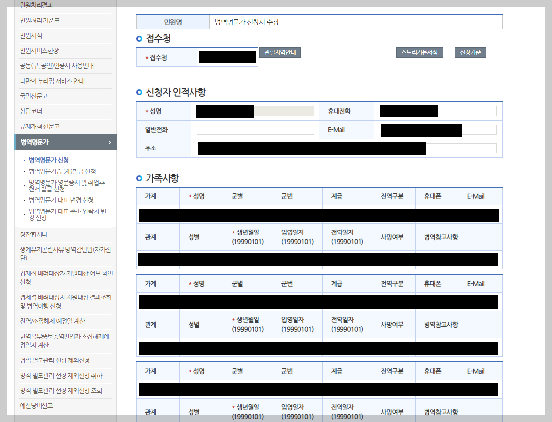 빨간 별표(성명, 생년월일) 이외에 군번, 계급, 입영일자, 전역일자 등 적을 수 있는 것은 모두 적어주시는 게 좋을 듯합니다.(저도 조부의 가족사항은 빨간 별표만 적었다가 보완 요청이 왔습니다.)