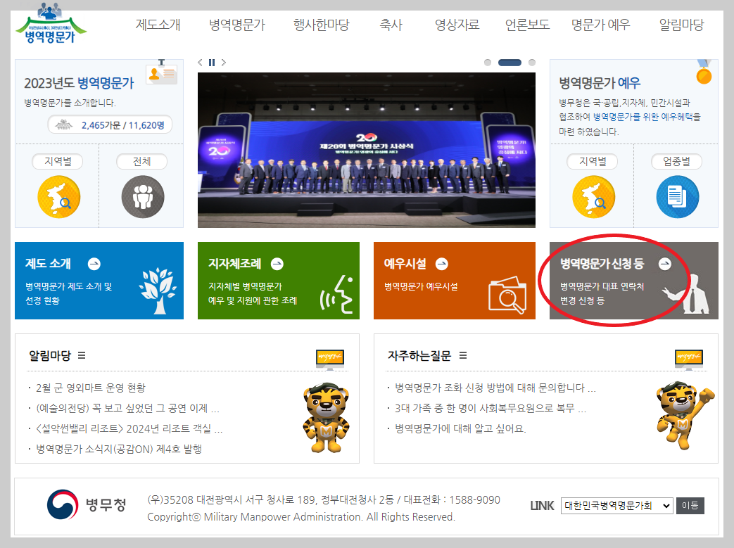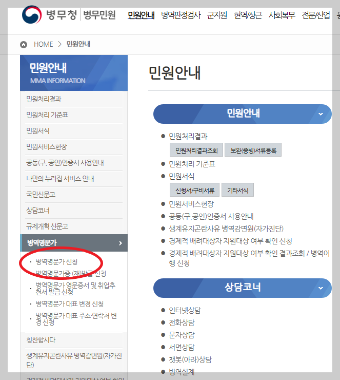 - 신청 방법 : 병역명문가 검색 → 홈페이지 접속 → 신청 → 정보 입력 → 증빙자료 첨부 → 신청 → 결과 안내