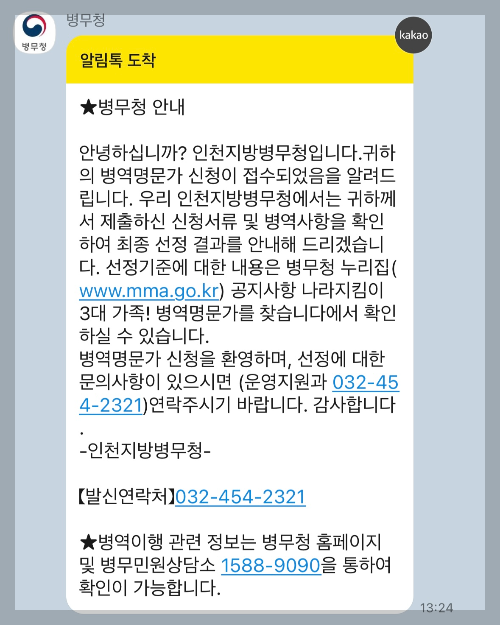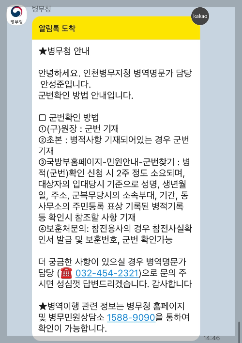 저는 1대의 군번 관련 보완 요청이 있어서 병무청에서 전화와 알림톡으로 친절히 안내해 주셨습니다.